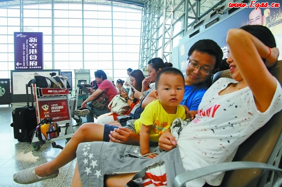 ![]() 圖為即將踏上旅程的一家三口在候機。 范照明 伍帥 攝影報道 ![]() |