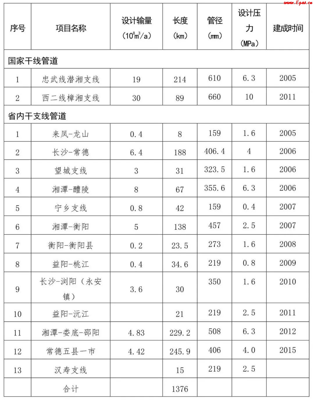 表1:湖南省內(nèi)已建成主要天然氣管網(wǎng)情況表