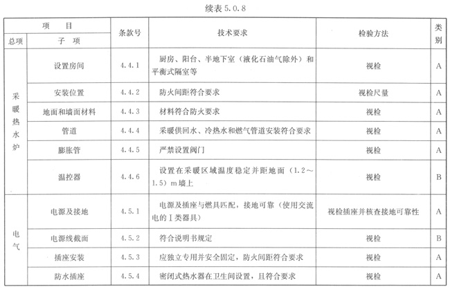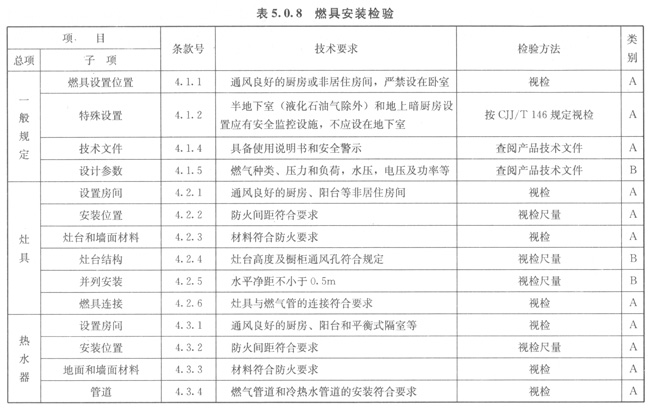 5.0.6燃具檢查項目及性能要求應符合本規(guī)程表5.0.7~表5.0.8的規(guī)定。類別A為主控項目應全檢,B為一般項目應抽檢。抽檢比例不應小于20%,且不應少于2臺。上述檢查合格和用戶簽字后張貼合格標示。
