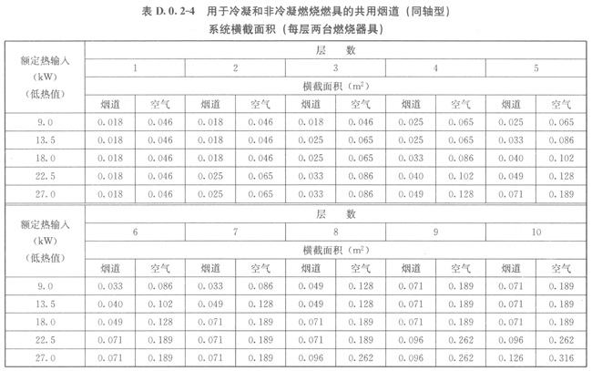 4當(dāng)每層設(shè)置2臺燃具時,同軸型煙道尺寸應(yīng)按表D.0.2-4的規(guī)定采用。
