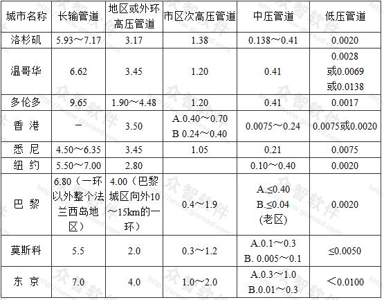 據(jù)西氣東輸長輸管道壓力工況,壓縮機(jī)出口壓力為10.0MPa,壓縮機(jī)進(jìn)口壓力為8.0MPa,這樣從輸氣干線引支線到城市門站,在門站前能達(dá)到6.0MPa左右,為城鎮(zhèn)提供了壓力高的氣源。提高輸配管道壓力,對節(jié)約管材,減少能量損失有好處;但從分配和使用的角度看,降低管道壓力有利于安全。為了適應(yīng)天然氣用氣量顯著增長和節(jié)約投資、減少能量損失的需要,提高城市輸配干管壓力是必然趨勢;但面對人口密集的城市過多提高壓力也不適宜,適當(dāng)?shù)靥岣邏毫σ赃m應(yīng)輸配燃?xì)獾囊?,又能從安全上得到保障,使二者能很好地結(jié)合起來應(yīng)是要點。參考和借鑒發(fā)達(dá)國家和地區(qū)的經(jīng)驗是一途徑。一些發(fā)達(dá)國家和地區(qū)的城市有關(guān)長輸管道和城市燃?xì)廨斉涔艿缐毫η闆r如表23。