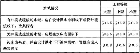 4.2.3 穿越水域的燃?xì)夤艿赖淖钚「餐梁穸?,?yīng)根據(jù)工程等級與相應(yīng)設(shè)計(jì)洪水沖刷深度或疏浚深度要求確定,并符合下列規(guī)定: