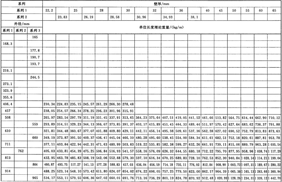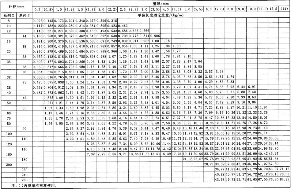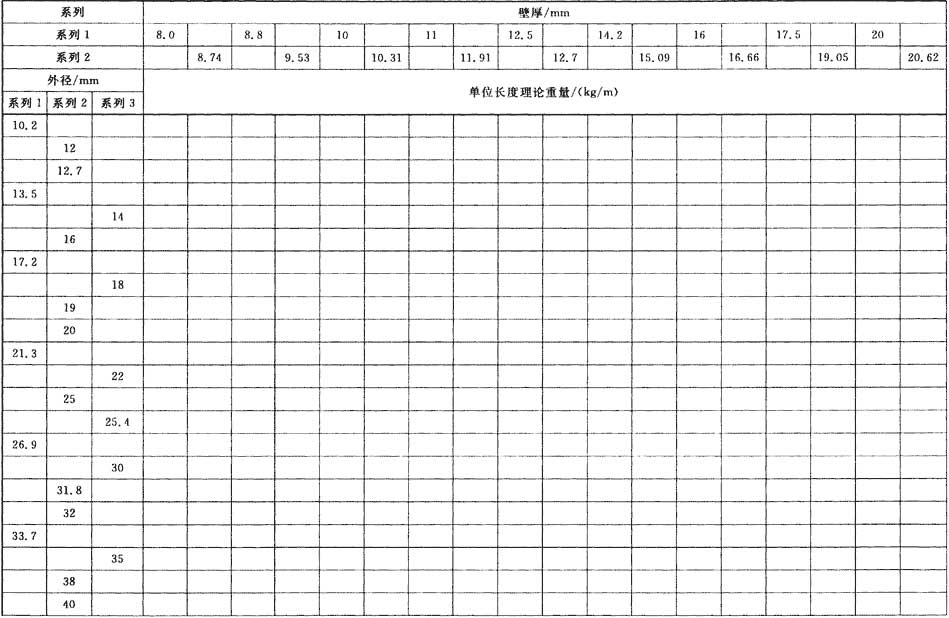 普通焊接鋼管和精密焊接鋼管單位長(zhǎng)度理論重量按式(1)計(jì)算(鋼的密度取7.85kg/dm3),其計(jì)算值分別列于表1和表2。