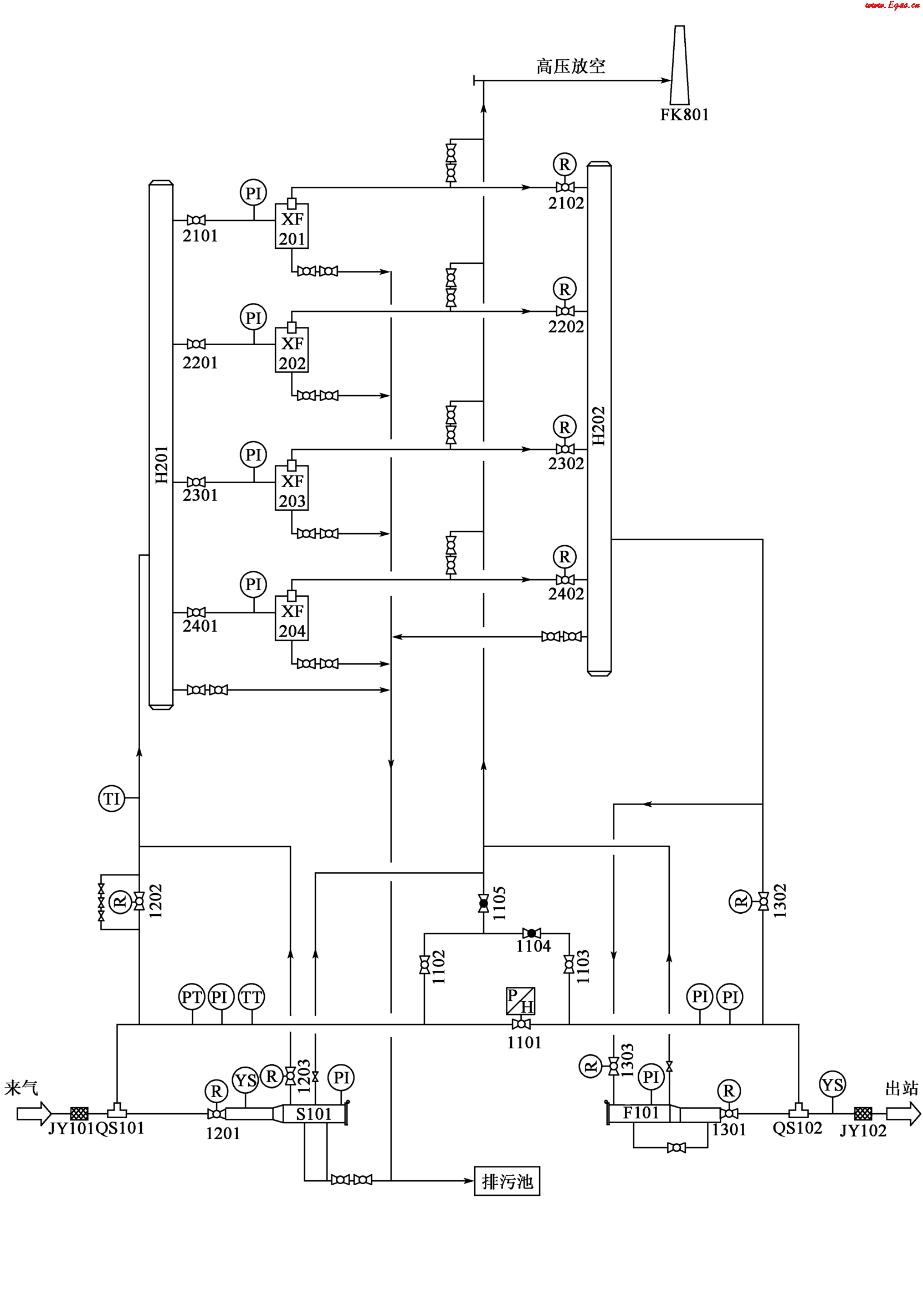 清管站的功能就是收發(fā)清管器。長輸管道的清管作業(yè)有投產(chǎn)前清管和正常運(yùn)行期間清管。投產(chǎn)前清管的主要目的是清除管道內(nèi)雜質(zhì),主要包括施工期間的泥土、焊渣、水等。正常運(yùn)行期間的清管是指管道運(yùn)行一段時間后,由于氣體內(nèi)含有一定的雜質(zhì)積存在管線內(nèi),使管輸效率下降,對管線造成腐蝕等,因此需要對管線進(jìn)行清管。常見清管站工藝流程圖,如圖3-1所示。