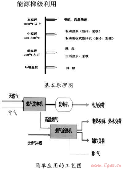根據(jù)“高能高用、低能低用、溫度對口、梯度利用”的原理,對天然氣燃燒產(chǎn)生的高溫?zé)煔?,通過發(fā)電機(jī)來提供高品位的電能,對發(fā)電機(jī)排出的煙氣,根據(jù)用戶的需求,或產(chǎn)生蒸汽、熱水,或轉(zhuǎn)換成冷能,或用于除濕,從而將天然氣所含的能量盡可能地“吃盡榨干”,從而實(shí)現(xiàn)能源的高效利用,同時(shí)也達(dá)到較好的經(jīng)濟(jì)性。