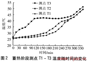 工作電壓為8V,余熱熱源溫度為32℃時,蓄熱階段測點T1~T3溫度隨時間的變化見圖2。由圖2可知,在蓄熱開始時期,測點T3處的石蠟吸收熱量后溫度有明顯的升高。在達到相變溫度(35℃)前,石蠟主要呈固態(tài),石蠟從熱管壁吸收的熱量主要用于其自身溫度的提高,以顯熱的形式儲熱。