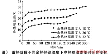 根據(jù)熱電熱泵原理,冷熱端溫差對熱電熱泵制熱性能有重要影響,冷熱端溫差越小,制熱性能系數(shù)越大。余熱熱源溫度的改變使得冷端的換熱條件發(fā)生改變,這也必將改變熱電熱泵相變蓄熱裝置的冷熱端溫差,進而影響熱電熱泵的制熱性能。蓄熱階段,不同余熱熱源溫度下冷熱端溫差隨時間的變化見圖3。由圖3可知,余熱熱源溫度越高,冷熱端溫差越小。