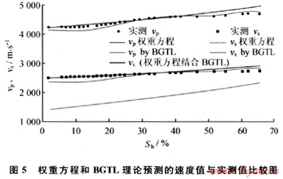 Hu等[14]利用上述實(shí)驗(yàn)數(shù)據(jù)驗(yàn)證了前人提出的速度模型,結(jié)果表明,在固結(jié)沉積物中,結(jié)合Lee等[15]提出的權(quán)重方程和Lee[16~17]提出的BGTL理論(Biot-Gassmann Theory by Lee)可準(zhǔn)確預(yù)測(cè)含水合物固結(jié)沉積物的縱橫波速度;在松散沉積物中,Dvorkin等[1]和Helgerud等[2]提出的等效介質(zhì)理論可準(zhǔn)確預(yù)測(cè)含水合物松散沉積物的縱波速度。由于BGTL理論從物理模型上將水合物視為基質(zhì)中的一種礦物成分看待,等效介質(zhì)理論的3種模式則分別指示水合物在孔隙流體中、與沉積物顆粒接觸或與沉積物顆粒膠結(jié),因此,筆者利用這些速度模型探討了不同類型沉積物中水合物的分布及其影響情況。