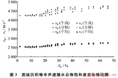 水合物的微觀分布對(duì)沉積物的聲學(xué)性質(zhì)具有重要影響:在固結(jié)沉積物中,由于在孔隙流體中生成,0~10%飽和度的水合物對(duì)聲速影響甚小;在松散沉積物中,由于水合物膠結(jié)沉積物顆粒生成,微量的水合物(飽和度1%左右)使縱波速度陡增。這表明,了解水合物的微觀分布對(duì)水合物資源估算具有重要的指導(dǎo)作用。