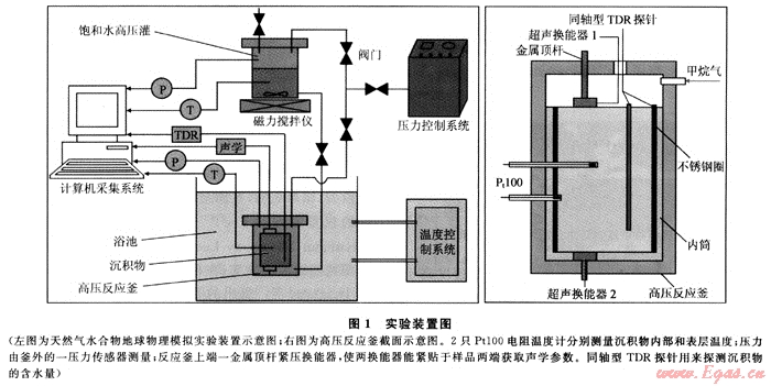 實(shí)驗(yàn)在青島海洋地質(zhì)研究所水合物實(shí)驗(yàn)室地球物理模擬實(shí)驗(yàn)裝置上進(jìn)行,該裝置主要由高壓反應(yīng)釜及內(nèi)筒、溫控系統(tǒng)、壓力控制系統(tǒng)、測(cè)試系統(tǒng)(包括超聲探測(cè)和時(shí)域反射探測(cè))和數(shù)據(jù)采集系統(tǒng)5大功能模塊組成(圖1)。實(shí)驗(yàn)過程為:在高壓反應(yīng)釜中模擬海底真實(shí)的溫度壓力條件,使水合物在沉積物中形成,同時(shí)采用超聲探測(cè)技術(shù)和時(shí)域反射技術(shù)(TDR,Time Domain Reflectometry)實(shí)時(shí)探測(cè)全過程中沉積介質(zhì)的聲學(xué)參數(shù)和水合物飽和度。為加快水合物生成進(jìn)程,實(shí)驗(yàn)采用300mg/L的SDS(十二烷基硫酸鈉)溶液和99.99%甲烷生成水合物。實(shí)驗(yàn)的詳細(xì)介紹見本文參考文獻(xiàn)[8]、[9]。