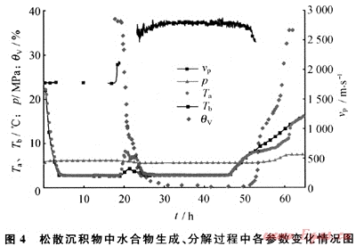 松散沉積物為采自于青島海邊的天然砂,粒徑為0.18~0.25mm,其物質(zhì)成分及含量如表2所示。由于難以探測(cè)松散沉積物的橫波速度,本文實(shí)驗(yàn)僅獲取了縱波速度隨水合物生成和分解的變化情況(圖4)。結(jié)果表明,水合物剛開始生成時(shí),縱波速度有一個(gè)陡然增大的現(xiàn)象,隨后由于超聲衰減極大,縱波速度難以獲取[13]。水合物完成生成時(shí),含水合物松散沉積物的縱波速度為278m/s左右,比含飽和水沉積物的聲速增長(zhǎng)1000m/s左右。