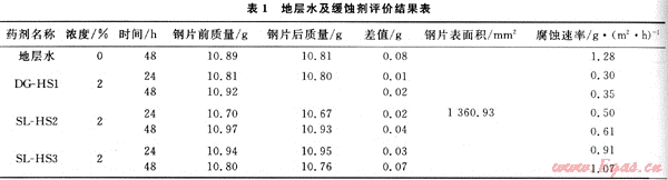 初步評價的結(jié)果為:地層水的腐蝕速率較高,為1.28g/m2·h,因此,在修井過程中應(yīng)當(dāng)采取必要的防腐蝕措施;由表1中結(jié)果可知,咪唑啉類的緩蝕劑(DG-HS1)的腐蝕速率最低,故選其作為修井液的組成成分之一。
