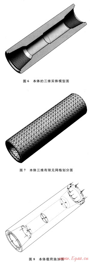 利用SolidWorks三維CAD軟件,得到的本體的三維實體模型(見圖6),利用COSMOS/Works自動劃分網(wǎng)格,建立有限元模型(見圖7、8)。劃分好的有限元模型與實體模型基本吻合,無“贅余”與“凹陷”,劃分較為準(zhǔn)確。
