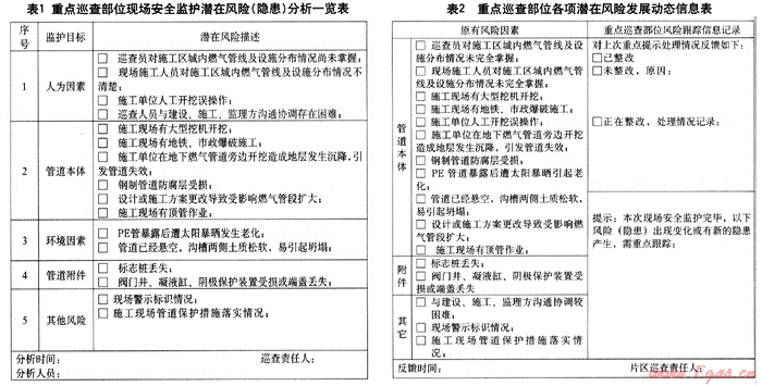 通過(guò)確定監(jiān)護(hù)目標(biāo)并以此為前提實(shí)施風(fēng)險(xiǎn)識(shí)別,同時(shí),對(duì)風(fēng)險(xiǎn)識(shí)別的結(jié)果做跟蹤監(jiān)控,根據(jù)監(jiān)護(hù)目標(biāo)在施工過(guò)程中出現(xiàn)的變化調(diào)整監(jiān)控措施,隨時(shí)關(guān)注第三方施工工地區(qū)域內(nèi)影響燃?xì)夤艿腊踩\(yùn)行的危險(xiǎn)因素,并且適時(shí)采取措施予以控制;將項(xiàng)目目標(biāo)動(dòng)態(tài)控制原理應(yīng)用在城鎮(zhèn)地下燃?xì)夤芫€巡查中,能切實(shí)提高現(xiàn)場(chǎng)安全監(jiān)護(hù)效率。
