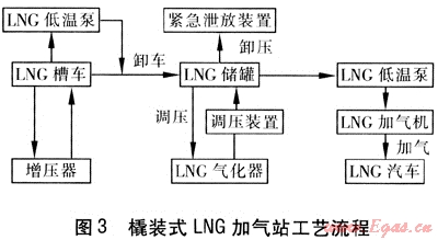 橇裝式LNG加氣站將LNG通過(guò)低溫泵向LNG汽車加氣。如有需要,也可同時(shí)經(jīng)高壓液體泵加壓、經(jīng)氣化器氣化后向CNG汽車加氣,并且比同樣容量CNG加氣站的造價(jià)和運(yùn)行費(fèi)用低。另外,橇裝式LNG加氣站還有以下優(yōu)勢(shì):