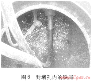 ② 管道開孔過程中產(chǎn)生的鐵屑很明顯(見圖6),除部分細微顆?;蚍勰┝⒓幢粴饬鞔档较掠?,依舊有部分較大塊的鐵屑暫時殘留在三通管件周圍,如施工單位或設備制造單位能設計一種專用工具(如磁性探棒),設法取出大部分殘留的鐵屑,將對下游設備安全穩(wěn)定運行產(chǎn)生深遠意義。