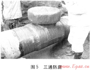 ④ 三通管件防腐使用從德國引進的新型防腐材料(見圖5),該材料具有創(chuàng)傷自動修復功能,使用方便、黏結優(yōu)異、抗陰極保護剝離性強;使用電火花檢漏儀100%檢查防腐層,合格后回填;