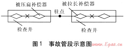 在直埋管道管系中,為減少固定支座的數(shù)量,往往布置成“駐點”形式。直埋管道兩個規(guī)格型號相同的相鄰補償器之間管道中點不設固定點,當管道受熱均勻膨脹時,在兩個補償器中間必然形成一個力的相對平衡點,即駐點。理論上以該點為界,管道向左右兩個方向均勻膨脹,一般認為,力的平衡點會因管道受力不均勻而發(fā)生少許偏移,一般按20%余量進行考慮。筆者認為,這種布置方式值得商榷。武威市城南集中供熱有限責任公司有一段直埋管道(Ø630×10)采用這種布置方式,固定支座之間距離為206m,兩只補償器規(guī)格型號完全相同,補償量均為150mm。在2008年熱網(wǎng)運行中,其同側兩個補償器相繼發(fā)生故障,拆解后發(fā)現(xiàn),一個補償器已被壓扁,壓縮量200mm,另一個不僅未起到補償壓縮作用,反而被拉長50mm,一個補償器伸長對另一個補償器造成過度壓縮,從而使兩個補償器均發(fā)生破壞失效,事故管段示意圖見圖1。