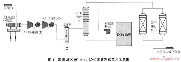 天然氣預(yù)處理系統(tǒng)包括過(guò)濾分離、增壓、二甘醇胺(DGA)脫CO2和分子篩干燥部分。流程簡(jiǎn)圖見(jiàn)圖1。