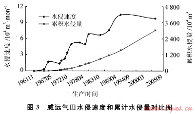 圖3是在滿足最優(yōu)擬合偏差函數(shù)最小時,在水侵動態(tài)分析和生產(chǎn)動態(tài)數(shù)據(jù)的基礎(chǔ)上得到的水侵速度和累積水侵量與生產(chǎn)時間的關(guān)系。水侵速度呈臺階式上升,這和開采階段密切相關(guān)。