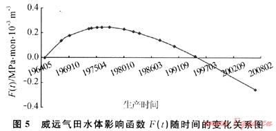 另一方面,從函數(shù)F(t)隨時間的變化關(guān)系曲線(圖5)可知,在威遠(yuǎn)氣田開井投產(chǎn)初期,由于采氣速度高、底水沿裂縫竄進(jìn)侵入氣藏、水體能量表現(xiàn)為逐漸增大;在進(jìn)入生產(chǎn)中期時,水體的彈性能量開始逐漸減弱,水體的膨脹程度開始逐漸減小,進(jìn)入生產(chǎn)末期后,使函數(shù)F(t)形成一種持續(xù)下降甚至為負(fù)值,表明隨著水體能量的大量釋放以及受威遠(yuǎn)氣田大面積關(guān)井影響,部分地層水有可能出現(xiàn)沿大裂縫系統(tǒng)回退的現(xiàn)象,說明整個水體能量表現(xiàn)為具有可排性,如果在合適的位置打排水井大量排水,可使氣藏的采收率得到大幅度地提高。