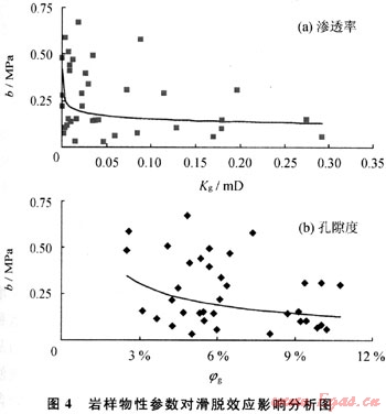 滑脫效應(yīng)強(qiáng)弱程度可采用滑脫因子描述;滑脫因子(b)越大對(duì)氣體滲流影響越大,反之越??;不同物性參數(shù)條件下氣體滑脫效應(yīng)現(xiàn)象程度強(qiáng)弱不一樣。研究表明:隨著氣相有效孔隙度、有效滲透率增加,滑脫效應(yīng)影響程度相應(yīng)減弱(圖4)。對(duì)于廣安氣田須六段氣藏,含水巖樣滑脫因子介于0.063~0.675MPa之間。