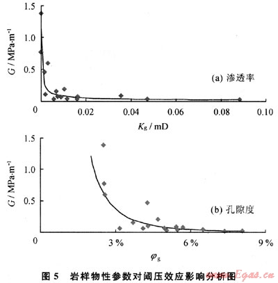 滲流機(jī)理實(shí)驗(yàn)研究表明:低滲透儲(chǔ)層的孔隙度、滲透率及含水飽和度達(dá)到一定程度時(shí),普遍存在著閾壓效應(yīng)。閾壓效應(yīng)的典型特征是當(dāng)壓力梯度達(dá)到一定程度時(shí),氣相才能保持連續(xù)流動(dòng)狀態(tài),該壓力梯度稱為臨界壓力梯度。臨界壓力梯度值越大,閩壓效應(yīng)越明顯,反之越小。不同巖樣物性參數(shù)條件下,臨界壓力梯度值不同。圖5為閾壓效應(yīng)、臨界壓力梯度(G)與物性參數(shù)的關(guān)系曲線??梢钥闯觯弘S著氣相有效孔隙度、有效滲透率增加,對(duì)應(yīng)的臨界壓力梯度逐漸降低;臨界壓力梯度與物性參數(shù)存在較好冪函數(shù)關(guān)系。