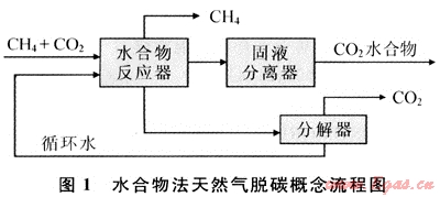 圖1為利用水合物分離技術進行天然氣中捕集CO2的流程:將經過預處理過酸性天然氣通入水合反應器,在合適的操作條件下使混合氣中易生成水合物的CO2組分生成CO2水合物,被提濃的CH4自反應器頂部引出。所生成的CO2水合物經脫水后可直接利用[20],或隨水轉入水合物分解器中,分解后回注油氣藏以提高采收率。分解后的水或水與添加劑的混合物返回水合反應器,循環(huán)利用。