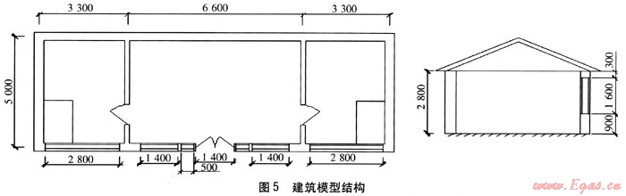 以抽樣調(diào)查得到的典型建筑為模型,確定建筑模型的建筑面積為66m2,坐北朝南,建筑窗墻比為0.52,體形系數(shù)為0.37,建筑模型結(jié)構(gòu)見(jiàn)圖5,圖中數(shù)值單位為mm。圍護(hù)結(jié)構(gòu)的傳熱系數(shù)見(jiàn)表1。按上述建筑結(jié)構(gòu)進(jìn)行耗熱量計(jì)算,室內(nèi)供暖設(shè)計(jì)溫度按14℃計(jì)算,得到單位建筑面積耗熱量為131W/m2,散熱器供暖系統(tǒng)供、回水溫度取80、60℃,地板輻射供暖系統(tǒng)供、回水溫度取55、45℃。