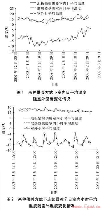 在建筑結(jié)構(gòu)、熱工性能、供暖面積、生活習(xí)慣相近的條件下,對(duì)分別采用散熱器、地板輻射供暖、散熱器+吊炕、散熱器+火炕供暖方式的室內(nèi)小時(shí)平均溫度進(jìn)行實(shí)測(cè)。在連續(xù)最冷7日內(nèi),采用散熱器供暖、地板輻射供暖的農(nóng)村居民室內(nèi)小時(shí)平均溫度較高,受室外溫度的影響較小,且地板輻射供暖熱穩(wěn)定性最好。采用散熱器+吊炕供暖的室內(nèi)溫度比采用散熱器+火炕供暖的室內(nèi)小時(shí)平均溫度高,但采用這兩種供暖方式的室內(nèi)小時(shí)平均溫度波動(dòng)性較大。