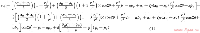 從式(1)可以看出:當pi增大時,σ′pθ變??;當pi增到一定程度時,σ′pθ將變成負值,即巖石所受周向應(yīng)力由壓縮變?yōu)槔欤斶@種拉伸力大到足以克服巖石的抗拉強度時,地層則產(chǎn)生破裂,此時值為破裂壓力。