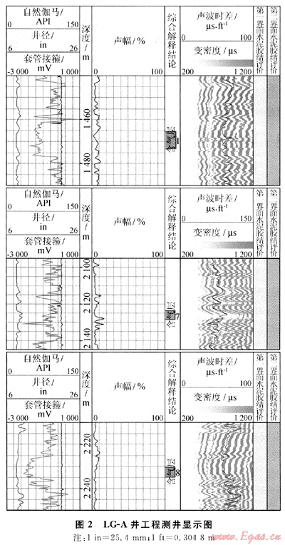 表1是LG-A井固井質(zhì)量的統(tǒng)計(jì)表。統(tǒng)計(jì)井段為0~2363.0m。
