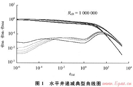 采用Stehfest反演算法[7~8],把qDd-tDd、qDdi-tDd以及qDdid-tDd繪制在雙對數(shù)坐標圖上,就得到了考慮井筒存儲效應和表皮效應的水平井產(chǎn)量遞減典型曲線圖版(圖1)。水平井遞減典型曲線的特征有:①氣藏中的水平井達到擬穩(wěn)態(tài)時,產(chǎn)量將急劇下降;②導數(shù)曲線存在早期、中期和晚期三段,早期為垂直徑向流階段,中期為平面徑向流階段,晚期為圓形封閉外邊界控制流階段j③與直井遞減典型曲線圖版相比,水平井遞減典型曲線在流動中期有一典型的“臺階”特征。