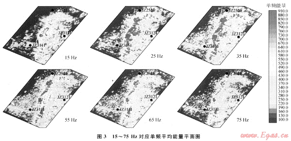 利用基于廣義S變換的頻譜成像儲(chǔ)層預(yù)測(cè)技術(shù)對(duì)JZ31-6構(gòu)造東二下段北部濁積體開(kāi)展了研究。利用頻率掃描結(jié)果分析東二下段北部濁積體整體和局部單頻能量強(qiáng)弱的變化,進(jìn)而了解砂體整體和局部特征如厚度、砂體尖滅邊界等。圖3為東二下段北部濁積體從15Hz到75Hz對(duì)應(yīng)單頻平均能量的平面圖,顏色越紅表示能量越強(qiáng)。從15Hz到35Hz的分頻平面圖反映出了該濁積體厚層和整體特征;從35Hz到75Hz的分頻平面圖,逐步反映出了砂體薄層和局部特征。35Hz的分頻平面圖比較模糊的地反映出了濁積體由3個(gè)局部砂體組成。在更高頻率的分頻平面圖上,更清楚地反映出北部濁積體是由3個(gè)局部砂體組成的。這一預(yù)測(cè)結(jié)果已被后來(lái)鉆井所證實(shí)。