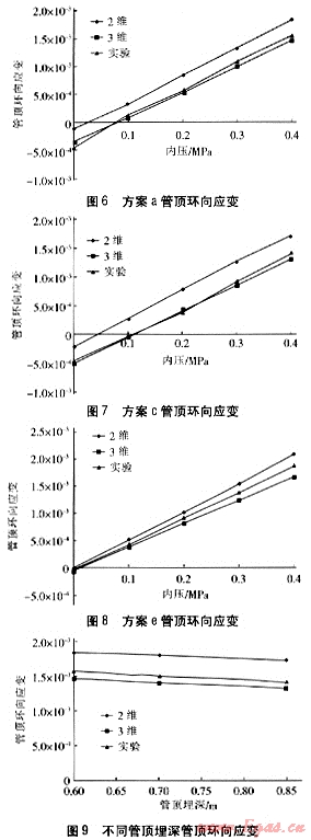 可以看出,管頂環(huán)向應(yīng)變的實驗結(jié)果與3維模型的計算結(jié)果非常吻合。圖9為不同管頂埋深、內(nèi)壓恒為0.4MPa下,實驗和計算結(jié)果的對比??梢钥闯?,不同管頂埋深管道周向各點環(huán)向應(yīng)變的實驗結(jié)果與3維模型計算結(jié)果很吻合。