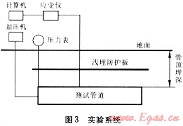 通過實驗分析,可以準(zhǔn)確了解埋地燃?xì)夤艿赖氖芰η闆r,而且,實驗也是驗證有限元法計算結(jié)果準(zhǔn)確性的重要手段。實驗系統(tǒng)見圖3。