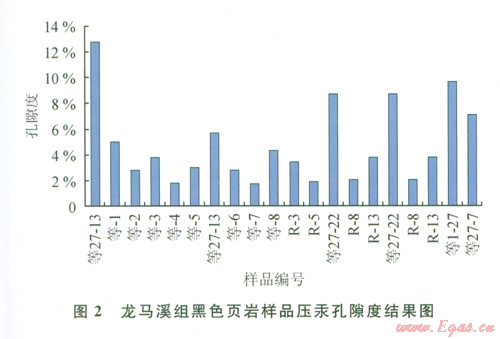 孔隙度是確定游離氣含量和評價頁巖滲透性的重要參數(shù)。頁巖氣儲層通常具有低孔隙度(小于l0%),低滲透率(小于0.001 mD)的特征。泥頁巖中通常同時存在原生孔隙和次生孔隙,原生孔隙系統(tǒng)由十分微細(xì)的孔隙組成,形成了大量的內(nèi)表面積,從而提供了潛在的吸附位置,以存儲大量氣體,但原生孔隙系統(tǒng)滲透率很低。研究區(qū)內(nèi)l7個下志留統(tǒng)龍馬溪組泥頁巖樣品的壓汞實驗結(jié)果表明:龍馬溪組黑色頁巖孔隙度介于1.71%~l2.75%,平均為4.71%,其頻度多分布在孔隙度超過4.0%的范圍,占到41.2%。相對于美國五大含氣頁巖3%~l4%的孔隙度而言,研究區(qū)龍馬溪組頁巖孔隙度屬于中等偏高。