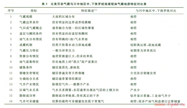 根據(jù)陳更生等[3]總結(jié)的北美頁(yè)巖氣藏l6種地質(zhì)特征與川中地區(qū)中、下侏羅統(tǒng)進(jìn)行對(duì)比的結(jié)果如表3所示。表3表明川中地區(qū)中、下侏羅統(tǒng)油氣藏,絕大多數(shù)條件具有與頁(yè)巖油氣藏類(lèi)似的特征。如第9項(xiàng):油氣富集特征,目前所獲常規(guī)油氣井,正是在“甜點(diǎn)”油氣富集區(qū)處,應(yīng)用常規(guī)(目前逐漸使用一些非常規(guī)的增產(chǎn)措施,如水平井,而酸化壓裂則早已引人使用)鉆井即能獲得工業(yè)油氣流,可以期待,隨著頁(yè)巖油氣藏開(kāi)采技術(shù)的引進(jìn)應(yīng)用,必將獲得更大的油氣產(chǎn)量;而成藏機(jī)制和資源量則需要重新進(jìn)行研究和評(píng)價(jià)。