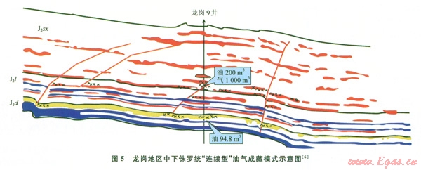 在構(gòu)造較平緩的斜坡帶地區(qū)如龍崗9井或龍崗7井等廣大的區(qū)域,中、下侏羅統(tǒng)的主要烴源巖為涼上段的黑色泥頁(yè)巖以及大安寨段的黑色泥頁(yè)巖、石灰?guī)r,這些烴源巖生成的烴類(lèi),首先由附近的小斷裂或(和)裂縫(構(gòu)造縫、層間縫)的疏導(dǎo),向就近的涼高山組或大安寨段中的具有一定儲(chǔ)集條件的砂巖中或富有溶蝕孔隙、裂縫的介殼灰?guī)r中運(yùn)移、聚集。從而形成一些自生自儲(chǔ)型的孤立的巖性或裂縫性油氣藏。