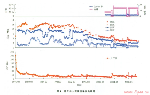 裂縫型油氣藏的生產(chǎn)特點(diǎn)是初始產(chǎn)量高、壓力下降快、能量衰減快、生產(chǎn)時(shí)間短。從柳X井的采油曲線來(lái)觀察,和許多川中地區(qū)其他構(gòu)造侏羅系的采油生產(chǎn)曲線特征相似——初始表現(xiàn)出裂縫型油氣藏的特點(diǎn):初始產(chǎn)量高、持續(xù)時(shí)間短、壓力下降快、連續(xù)生產(chǎn)時(shí)間短(該井在2001年之前沒(méi)有生產(chǎn)時(shí)率的紀(jì)錄,在有記錄的2001年1月-2010年4月整個(gè)生產(chǎn)過(guò)程中,生產(chǎn)時(shí)率介于2%~l2%,平均時(shí)率為6.1%。有些更低者可在2%左右,普遍小于20%);但是后期隨著時(shí)間的推移(2004年以后生產(chǎn)時(shí)率在3%以下),這時(shí)生產(chǎn)壓力會(huì)在較低壓力處恢復(fù)穩(wěn)定(圖4),總的生產(chǎn)時(shí)間長(zhǎng)(有些井間歇性產(chǎn)油可達(dá)數(shù)十年,如柳X井:1976-2010年,柳X井大安寨段油氣藏最終累計(jì)產(chǎn)原油達(dá)數(shù)萬(wàn)噸)。