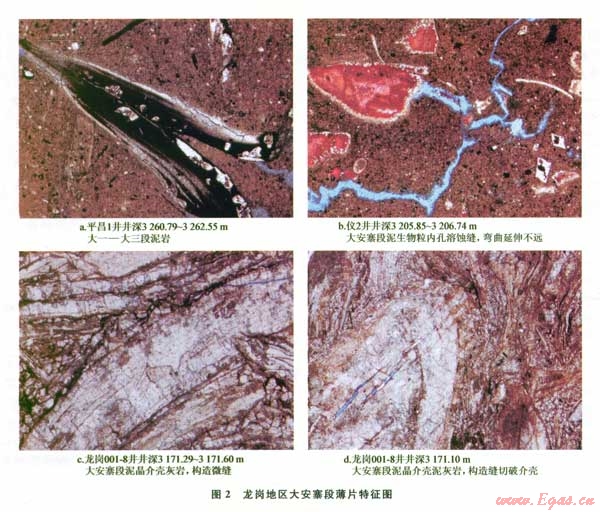 薄片觀察結(jié)果也表明,大安寨段石灰?guī)r、泥晶灰?guī)r以裂縫為主(圖2-a、b、C、d)。