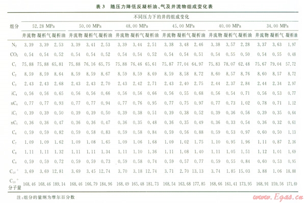 通過(guò)定容衰竭實(shí)驗(yàn)的模擬計(jì)算,可得到不同衰竭壓力下氣相、油相和井流物的組成,由此分析反凝析過(guò)程油氣組成的變化特征。本次計(jì)算出了從地層壓力52.28 MPa衰竭到34.OO MPa時(shí)不同壓力下反凝析油、凝析氣及井流物組成變化(表3)。