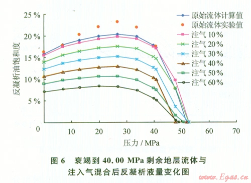 圖6為剩余地層流體與注入氣混合后反凝析液量變化。由圖6可見(jiàn),注氣后混合物體系反凝析液量降低,注入氣所占摩爾含量越高,反凝析液量降低越多。當(dāng)注入氣摩爾含量達(dá)到60%時(shí),最大反凝析液量約為7%,為原始井流物的30%。注氣量低于40%時(shí),混合物體系注氣露點(diǎn)壓力略有升高,當(dāng)注氣量超過(guò)40%后體系露點(diǎn)壓力從53.OO MPa下降到49.OO MPa。