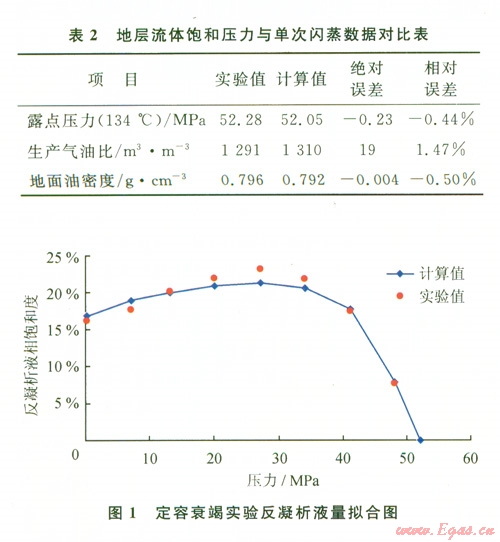 由表l和圖l可見(jiàn):實(shí)驗(yàn)值和計(jì)算值相對(duì)誤差均小于2%,總體擬合效果較好,能滿足后續(xù)相態(tài)模擬計(jì)算的需要。最大反凝析液量高,達(dá)到23%。