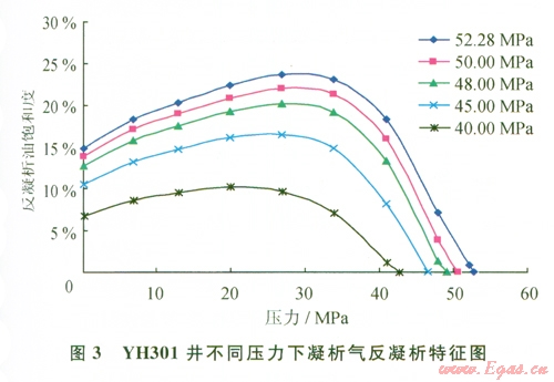在反凝析組成分析的基礎(chǔ)上,模擬計(jì)算了不同壓力下地層凝析氣相的p-T相圖(圖2)。由圖2可見(jiàn):從52.28 MPa下降到45.OO MPa,隨著壓力的減低,凝析氣露點(diǎn)壓力降低,包絡(luò)線向下縮小。始終處于飽和狀態(tài)。