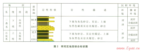 研究區(qū)上古生界石炭系太原組、二疊系山西組主要為海陸過(guò)渡沼澤相,發(fā)育富有機(jī)質(zhì)暗色泥頁(yè)巖、碳質(zhì)頁(yè)巖及煤層,泥頁(yè)巖連續(xù)厚度介于31.1~98