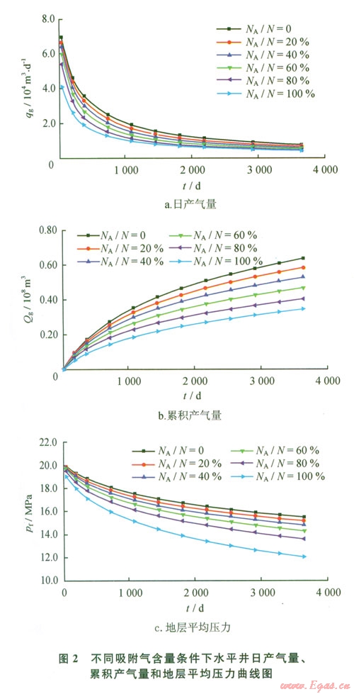 圖2給出了不同吸附氣含量條件下頁巖氣水平井的日產(chǎn)氣量、累積產(chǎn)氣量和地層平均壓力曲線。由圖2可知:吸附氣含量直接影響氣井的初始產(chǎn)量和遞減速度。吸附氣含量由0至100%時(shí),對(duì)應(yīng)的初始產(chǎn)氣量分別為6.97×