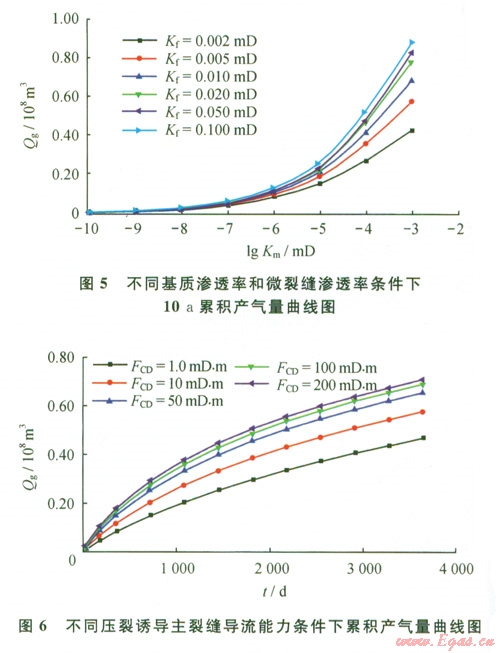 頁巖儲(chǔ)層基質(zhì)滲透率、微裂縫滲透率和壓裂誘導(dǎo)主裂縫的滲透率是影響氣體滲流過程的主要因素,也是影響頁巖氣水平井產(chǎn)能的主要因素之一。為了研究儲(chǔ)層滲透率對(duì)頁巖氣藏水平井產(chǎn)能的影響,設(shè)計(jì)了53套方案進(jìn)行模擬計(jì)算,將不同基質(zhì)滲透率、微裂縫滲透率和壓裂誘導(dǎo)主裂縫導(dǎo)流能力條件下氣井的累積產(chǎn)氣量進(jìn)行對(duì)比分析。