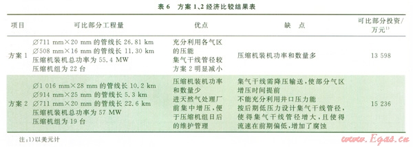 綜上所述,由于各氣區(qū)壓力衰減不一樣,增壓的時(shí)間也不一致,若采用天然氣處理廠前集中增壓,則各氣區(qū)進(jìn)天然氣處理廠增壓前必須保持壓力一致,不能充分利用各氣區(qū)的壓能,同時(shí)集氣干線管徑需按照增壓前的低壓進(jìn)行計(jì)算,增大了管徑。因此,從技術(shù)可行和經(jīng)濟(jì)合理方面綜合考慮,應(yīng)采用各氣區(qū)集中增壓方案。