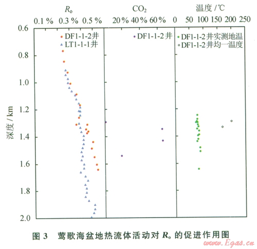 沉積地層中有機(jī)物對(duì)溫度的變化十分敏感,高溫?zé)崃黧w活動(dòng)無(wú)疑會(huì)加速有機(jī)質(zhì)的熱演化速度[7-8]。圖2顯示,在深度相同、時(shí)代相近的情況下,鶯歌海盆地DF